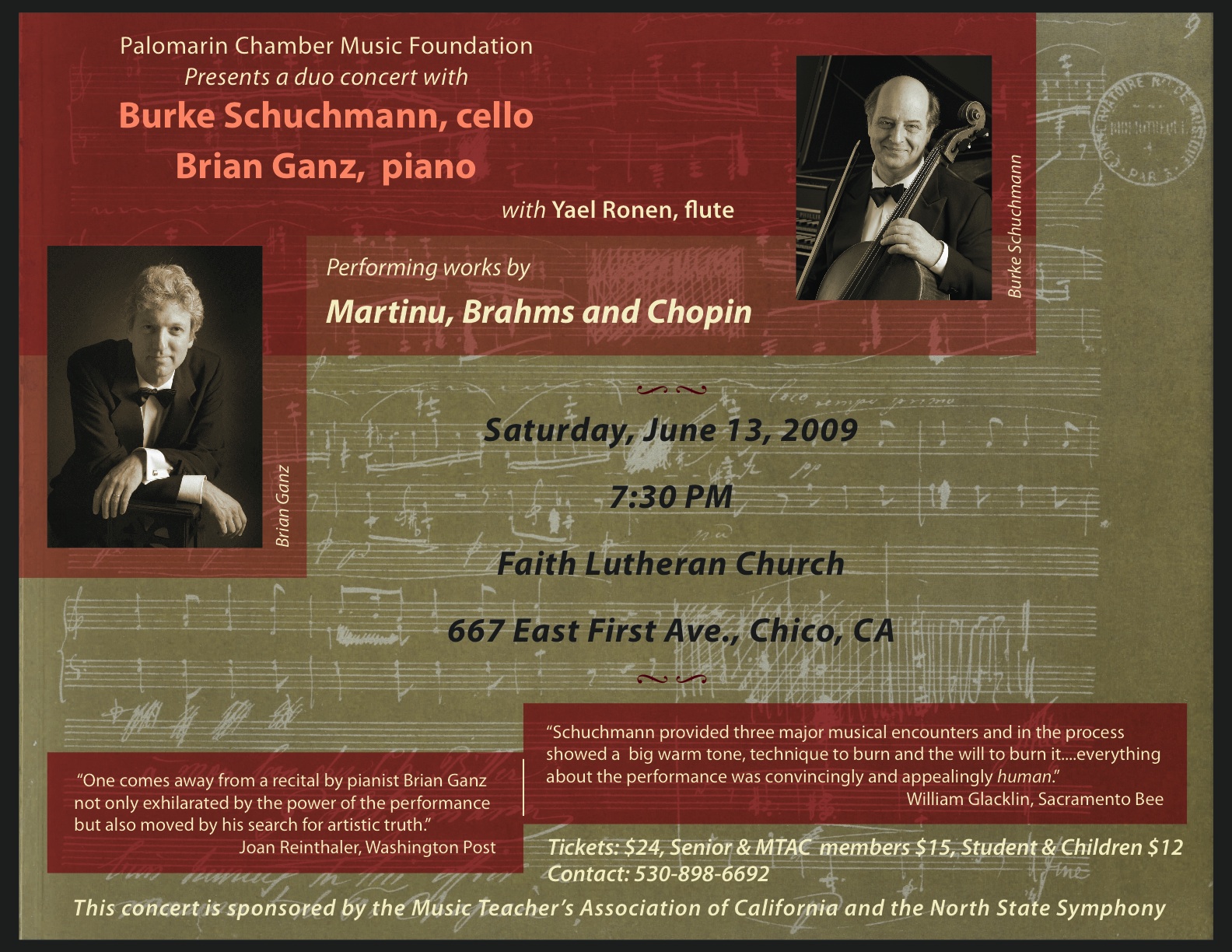 Program will include: Martinu's Flute Trio, Brahms' Cello Sonata in E minor,